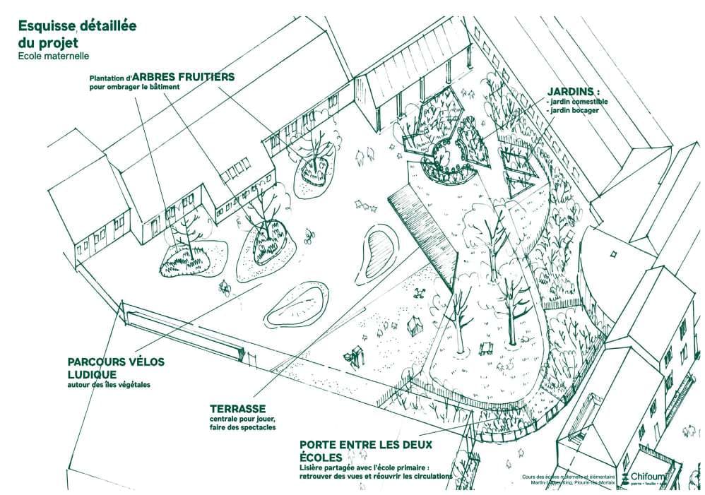 Dans le cadre de l'appel à projet CHIFOUMI porté par le CAUE du Finistère, nous avons apporté nos compétences de paysagistes-concepteurs à la co-construction des cours des écoles maternelle et primaire Martin-Luther King de Plourin-lès-Morlaix. L'enjeu spatial est de réorganiser les cours qui sont dos à dos pour imaginer une circulation entre elles, redéfinir la place des espaces calmes et actifs pour permettre des usages plus inclusifs, enlever l'enrobé superflu afin de donner au Vivant une large place.