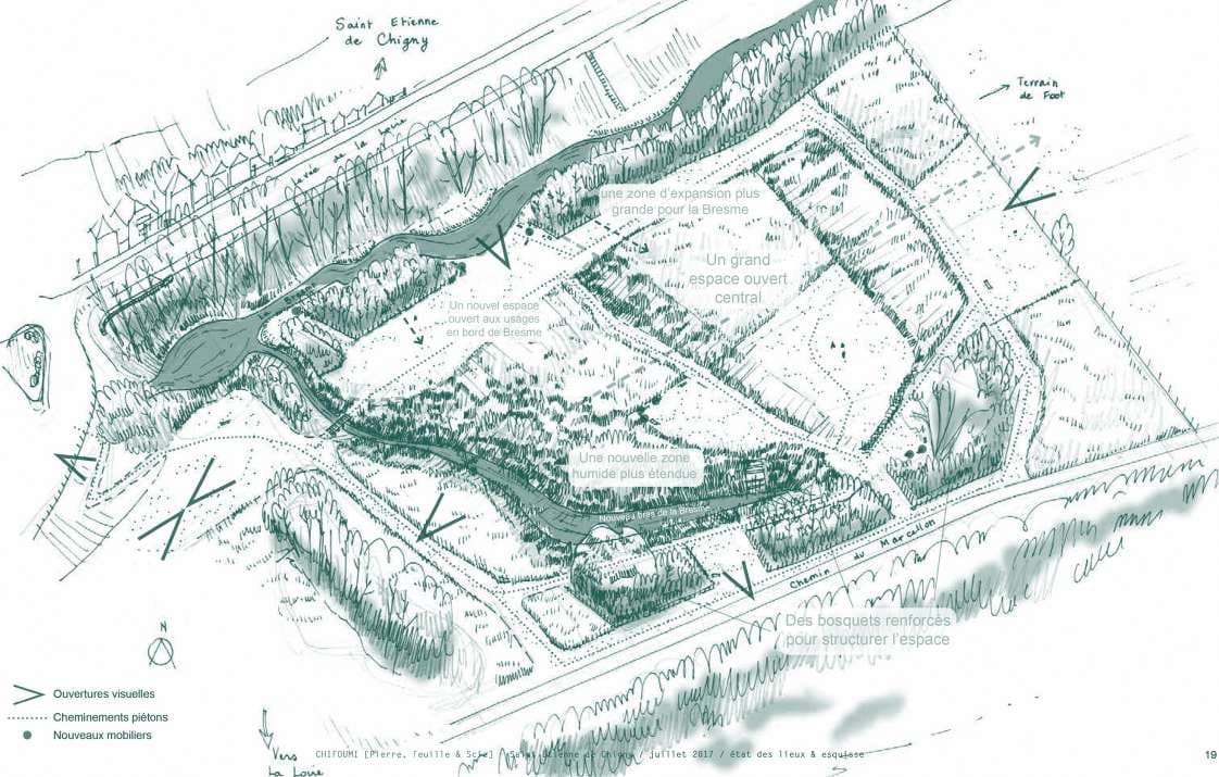 L'espace est complètement recomposé, pour replacer la Bresme au cœur du site, en visant sa renaturation : création d'un nivellement par paliers pour créer une diversité de milieux, régénération des boisements, mise en place d'une gestion extensive. Modeler ainsi le terrain permet un entretien étalé, engendrant une variété de milieux : une palette allant du bosquet à la prairie humide au milieu aquatique immergé. Réfléchi en dialogue avec la commune, la gestion dessine donc les milieux et les espaces de circulation. La totalité des terrassements est gérée en déblais/remblais, redistribués sur place.