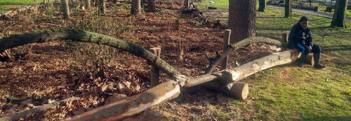 Le projet est réalisé en plusieurs chantiers. Les tilleuls coupés nous fournissent notre ressource principale. De nombreux ouvrages sont façonnés à partir du bois récupéré : paillage, clôtures et mises en défens, mobilier et jeux.