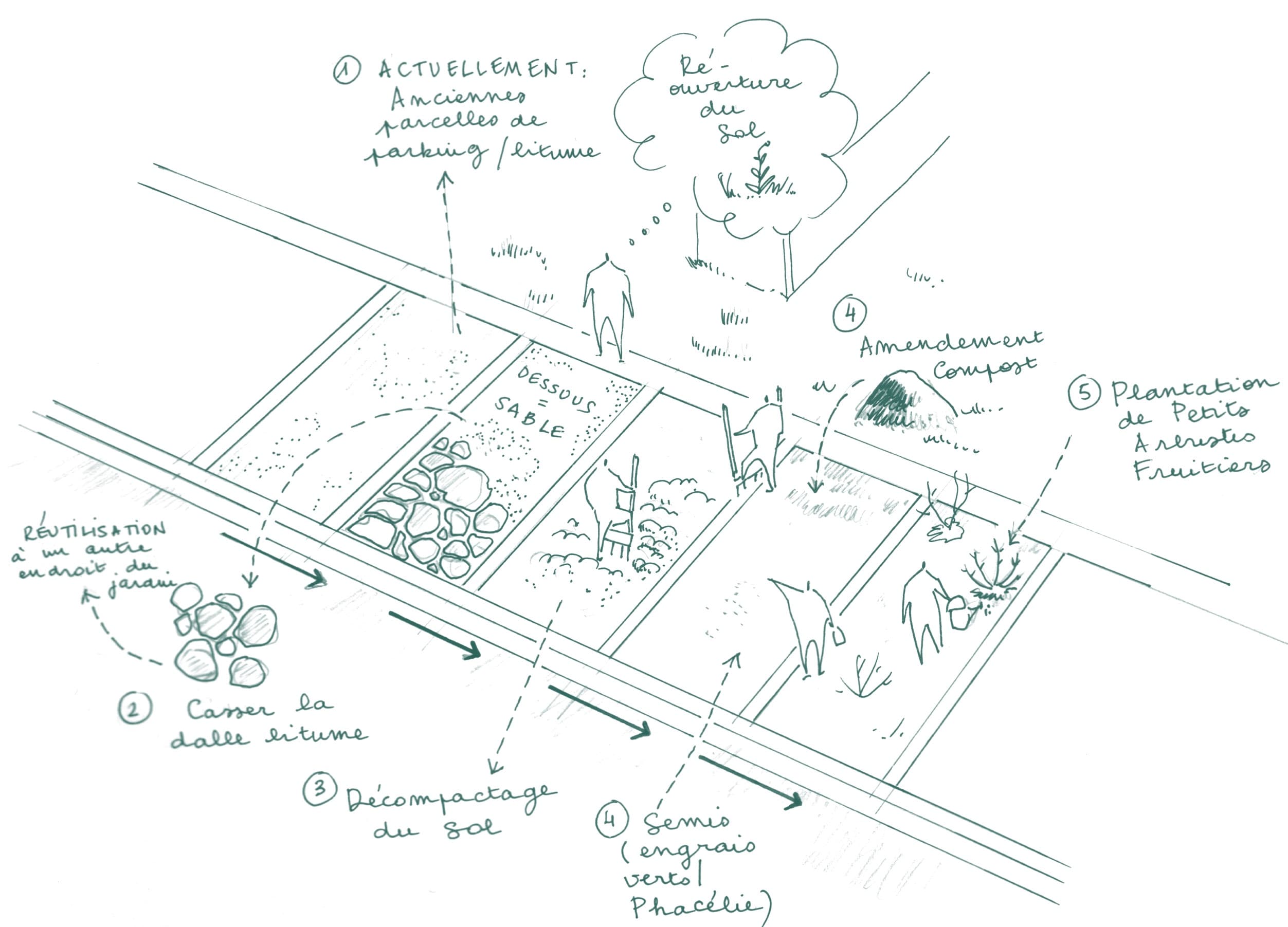 Nous désimperméabilisons aussi d'anciennes places de parking pour planter, ramener de la fraîcheur et un cadre plus accueillant pour les jardiniers.