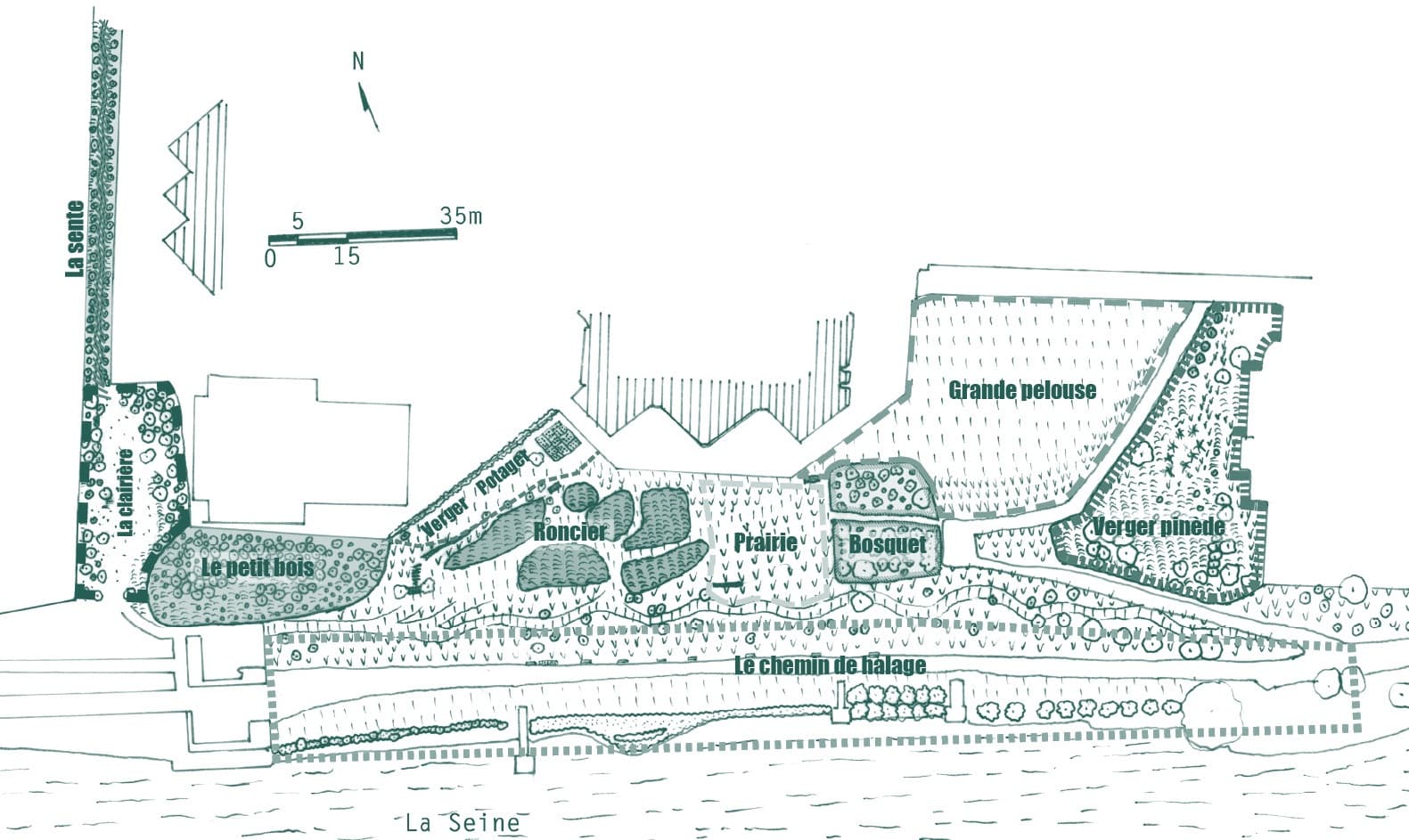 Le parc est organisé autour d'un vaste espace central. Des bosquets sont réservés. Sur la lisière la plus proche des jardins vivriers voisins, sont installées des parcelles de jardins partagés. Une cuve sert d'abri aux jardiniers et une pergola forme un point de rencontre. Le long du collège, nous testons différentes méthodes d'amélioration du sol (paillages, semis d'engrais verts, etc.). À l'extrémité du site, un belvédère est façonné à partir de déchets enfouis.